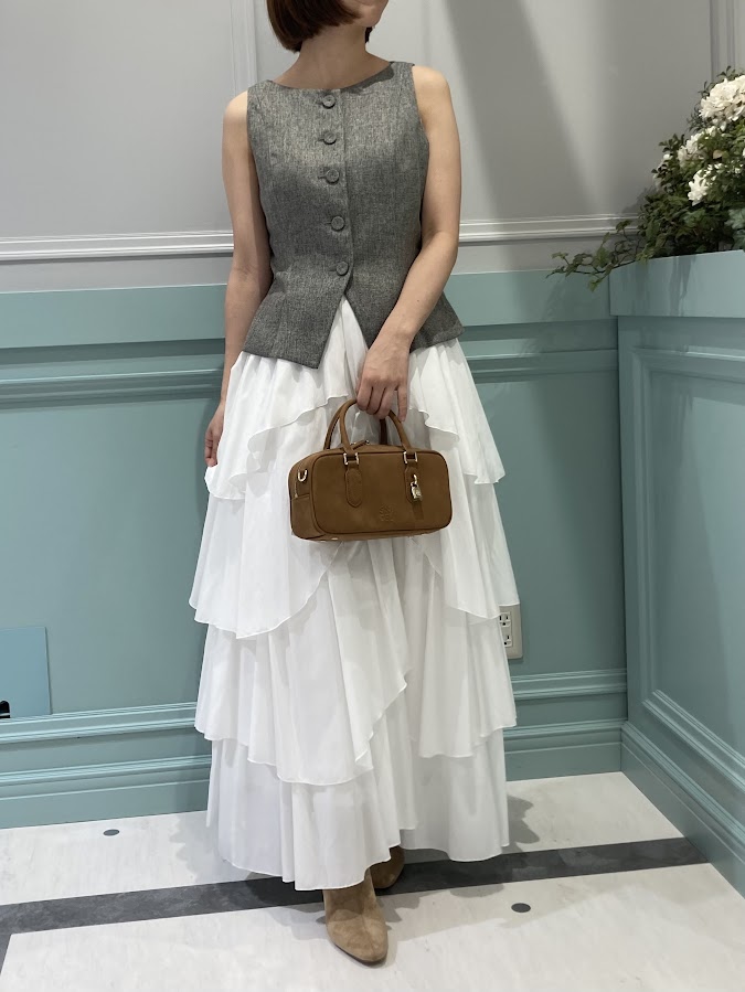 マニッシュなジレとフェミニンなティアードスカートの甘辛な組み合わせは、柔らかい曲線を持つ骨格タイプウェーブさんにピッタリです。