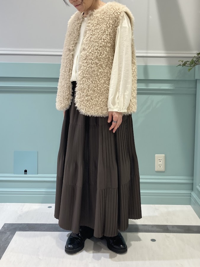 柔らかなフェザーの素材感と、スッキリとしたショート丈が魅力のジレは、骨格ウェーブタイプさんにおすすめです!