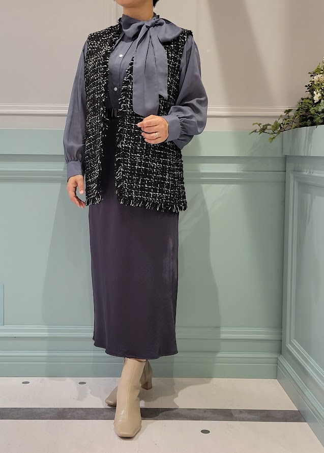 ・縦長シルエットを意識:ジレが作り出すⅠライン効果で、スッキリと縦長に見せてくれます。