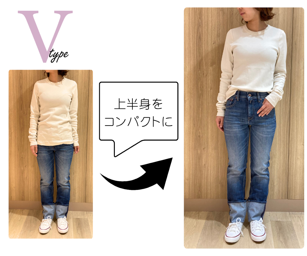 ウエストよりも肩幅が広く、下に向けて細くなるVタイプさんには、ストレートやワイドのようなシルエットがバランス良くみえます。