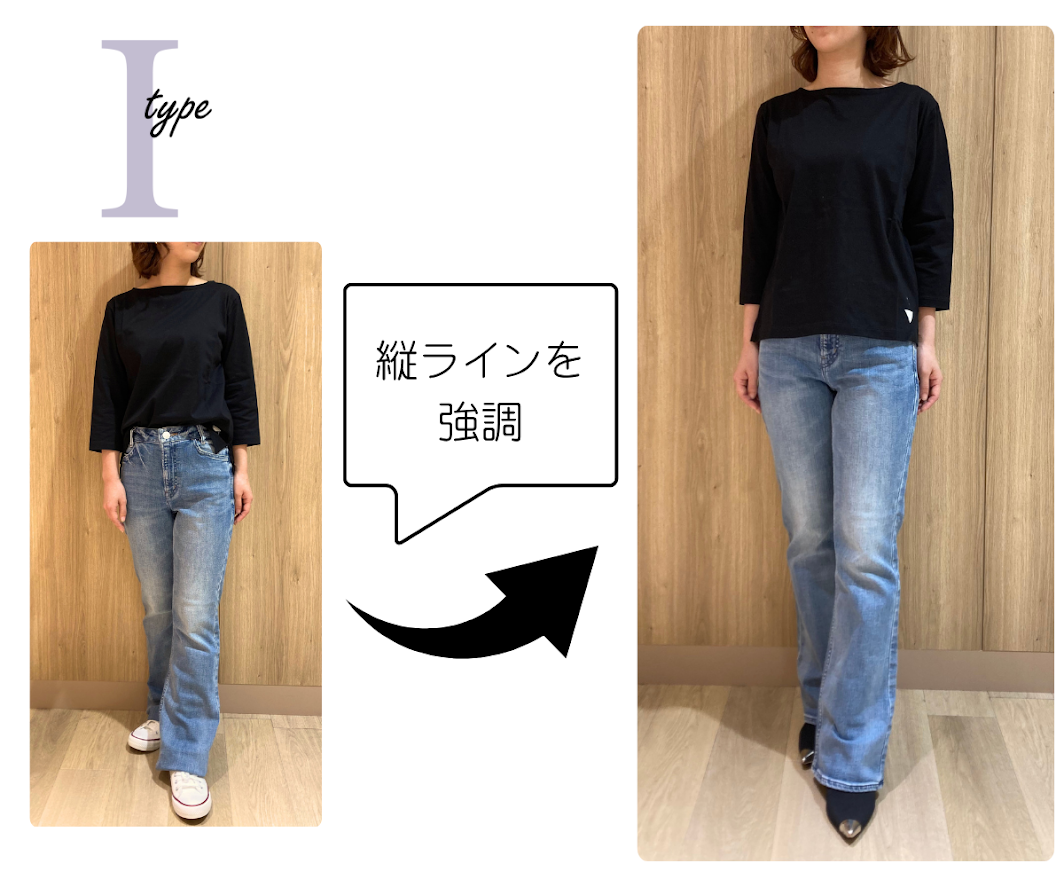 重心バランスに偏りが少なく直線的なラインが特徴のIタイプさんには、フレアやテーパードがお似合いです。