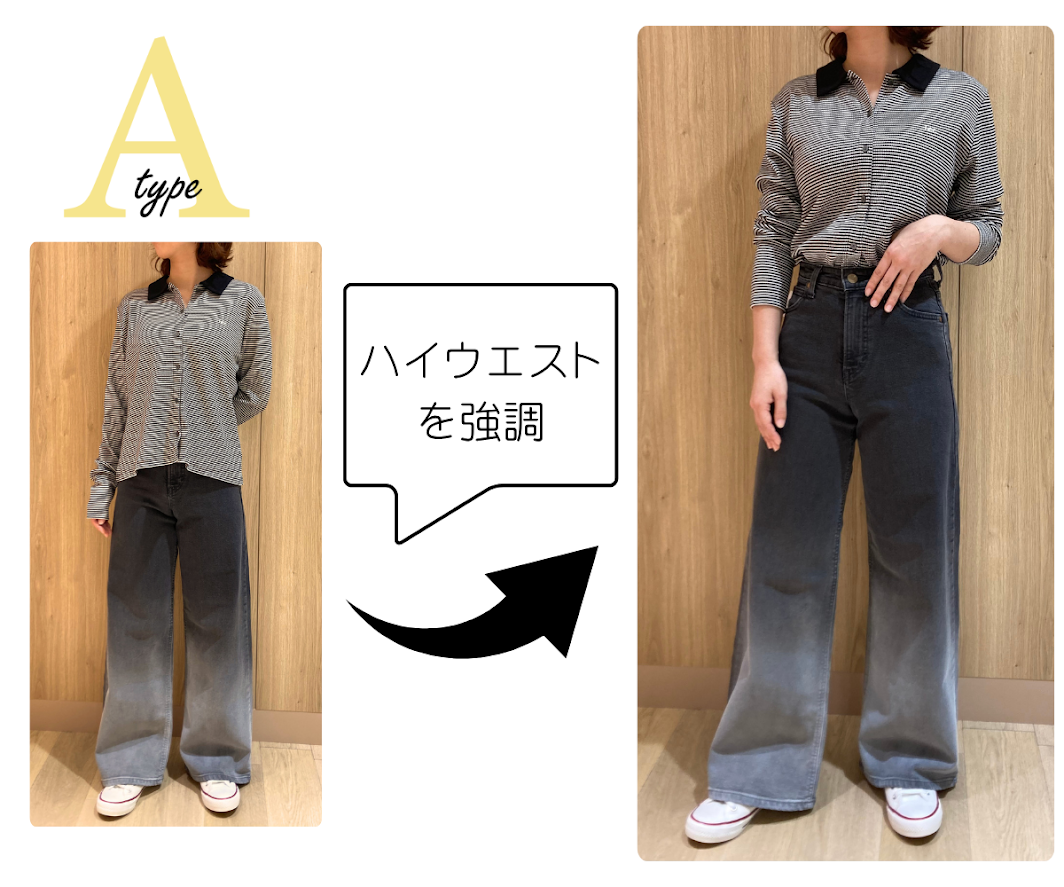 上半身と比べると下半身にボリュームがあり、曲線的なラインが特徴のAタイプさんは、ヒップ幅が目立ちにくいワイドやフレアがおススメです!